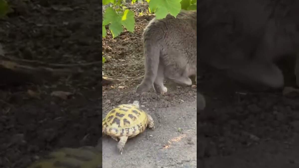 A testy tortoise went after a sleeping cat nipping at the feline's paws and chasing it around a garden.