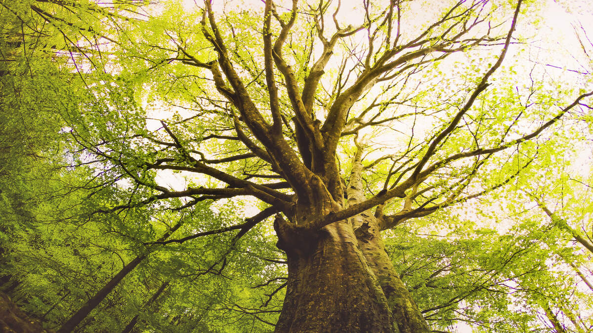 Beautiful beech tree taken directly from below with nice and old trunk during springtime with beautiful green colors in the Montseny nature reserve in the Catalonia region.
