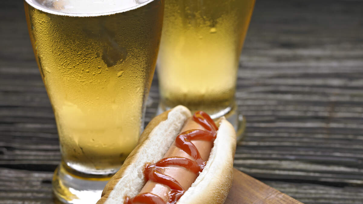 The fan poked holes in both ends of the hot dog before placing it in the beer and taking a sip through the makeshift straw.