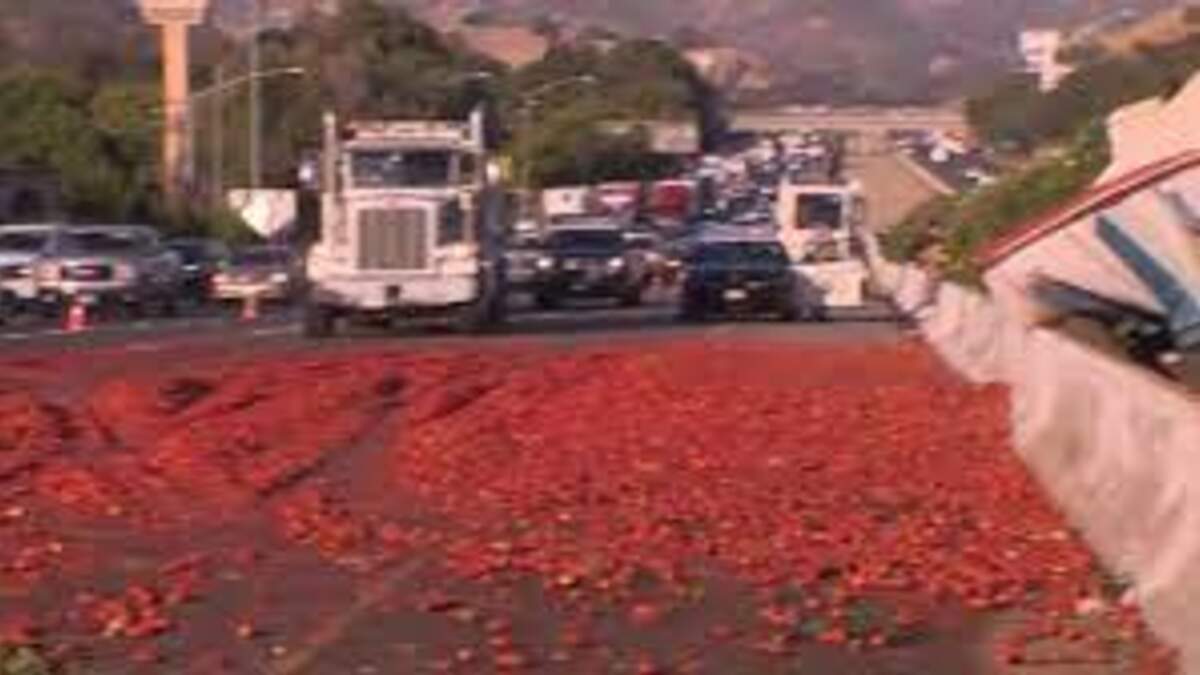 Crews mopped up tomato sauce for hours along Interstate 80 in Vacaville, where a big-rig jackknifed in a crash early Monday, spilling a load of tomatoes and sending cars skidding across the slick mess.