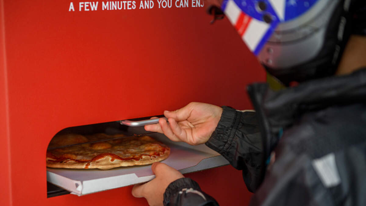 - The kiosk, which looks like a Redbox DVD rental machine, allows consumers to order a cheese or pepperoni pizza for $9 that is delivered through a slot in the machine ready to eat in three minutes.