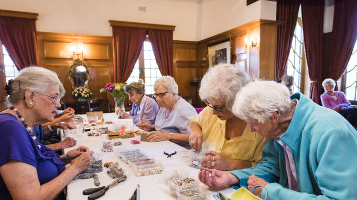 Group of senior women at a table making handmade jewellery with beads