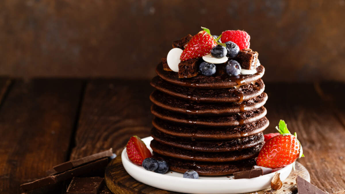 Ombre chocolate pancakes with fresh berries and chocolate sauce