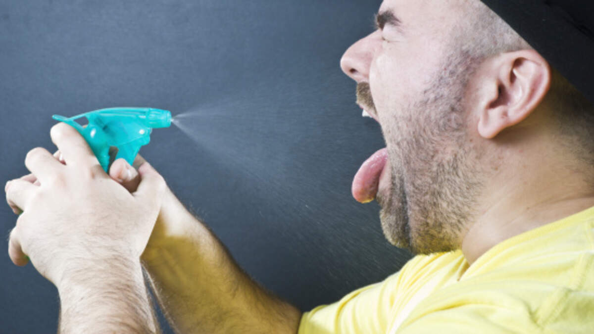 From a distance you see a group of people entering the polling center and an old man who appears to be squirting Hand Sanitizer in his MOUTH.