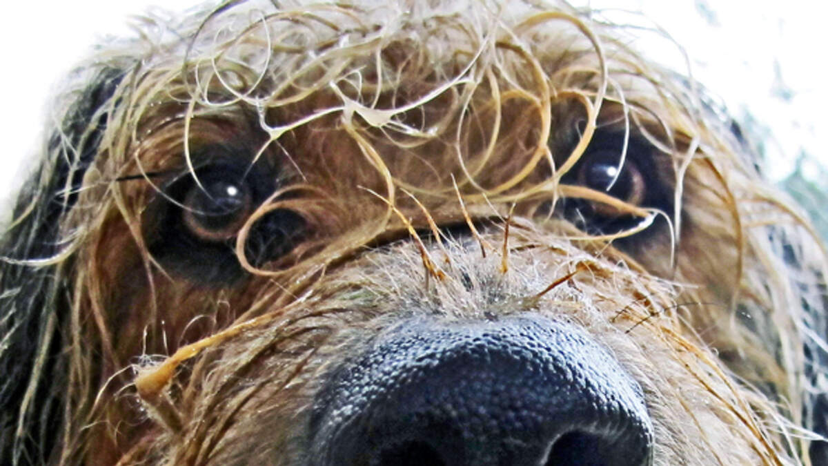 In the video there is a dog curled up in front of a shop on a street in the RAIN.