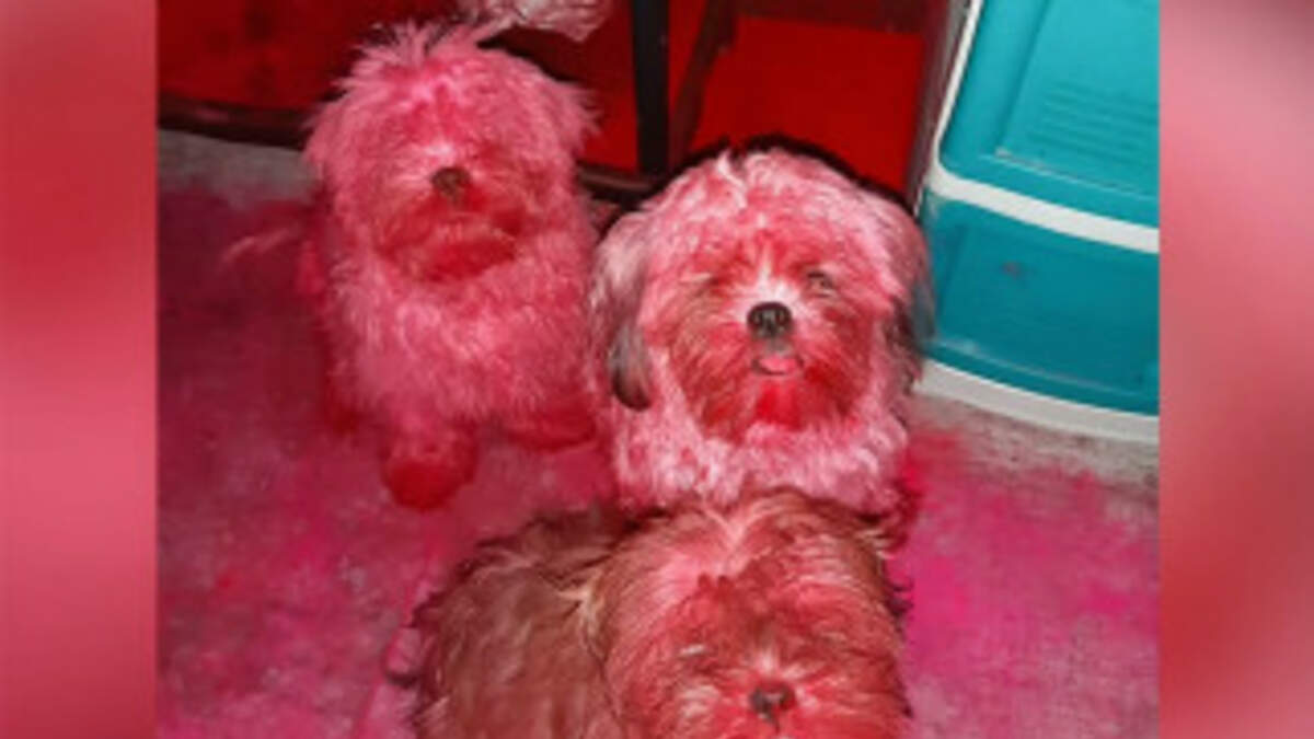 Three naughty dogs in the Philippines, were pretty in Pink after they dyed themselves rosy when they chewed through their owner's red-tinted makeup powder.
